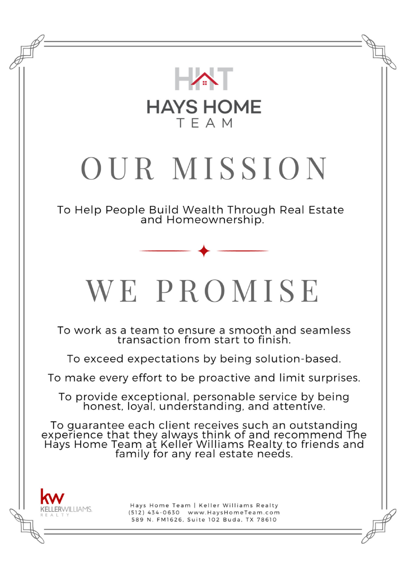 Investment Maintain It Perform routine maintenance on your home’s systems, depending on their age and style. Keep an eye on it Watch for signs of leaks, damage, and wear. Fixing small problems early can save you big money later. Keep a file of receipts for your repairs. Consider obtaining a home warranty. Your homeowner's insurance policy and home warranty provide coverage and protection when the unexpected happens. STEP 10 Enjoy Service for A Lifetime Our Work Doesn't Stop When You Close on Your Home. We will... Help you file for your homestead exemption Help guide you when you protest property taxes Provide a vendor list for home maintenance, repairs, and remodels Advise you on your home’s value Advise you on home improvements and maintenance Invite you to client events (New Year's Day, 4th of July, Pies & more) Help you with your next real estate transaction(s)