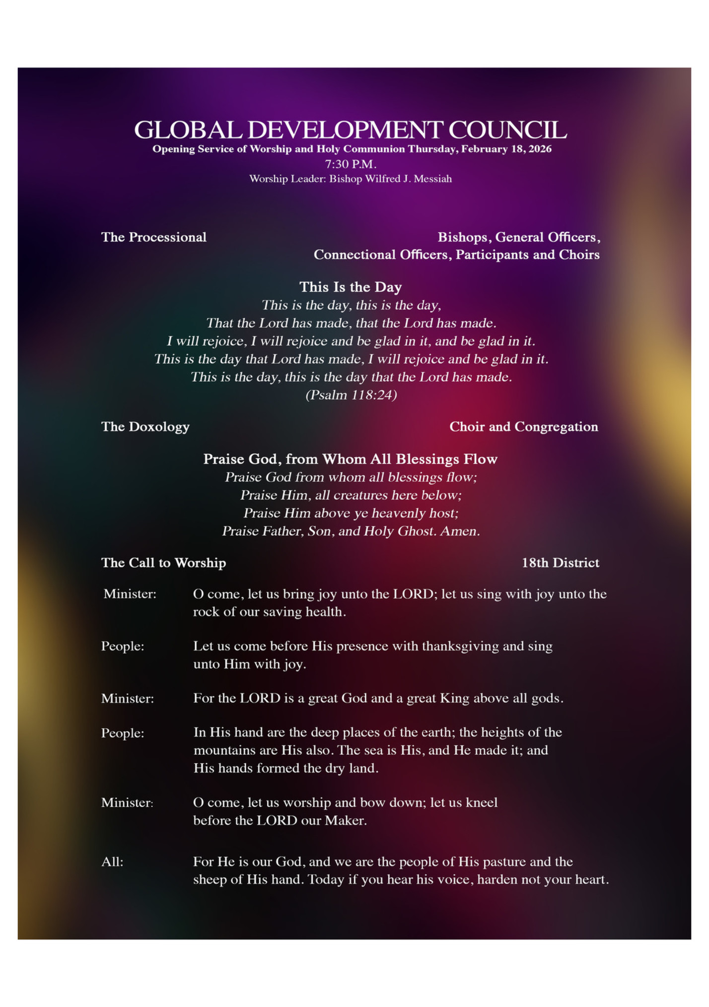 13th General Assembly Program Theme: Pathways to Possibility: Navigating Growth in Faith Tuesday, Feb 17, 2026 - Saturday, Feb 21, 2026 Radisson Blu Hotel & Residence Maputo, Mozambique Hosted by 18th Episcopal District Agenda Tuesday, February 17, 2026 9:00am - 1:00pm RAYAC Convergence 10:00 a.m. - 6:00 pm GDC Registration 2:00 p.m. 3:30 pm WMS Meeting 8:00 a.m. 4:30 pm WIM Meeting 4:00 pm - 6:00 p.m. LOADI Executive Board Meeting Wednesday, February 18, 2026 8:00 am - 5:00 p.m. GDC Registration 8:00 am - 12:30 p.m. LOADI Business Session 1 10:00 am Tea Break 12:30 pm - 1:45 p.m. Lunch 2:00 pm - 5:00 p.m. LOADI Business Session 2 5:00 pm Tea Break 5:30 pm - 7:15 p.m. Dinner on your own 7:30 p.m. Opening Worship Service Thursday, February 19, 2026 7:00 a.m. - 8:30 a.m. Breakfast on your own 9:00 a.m. - 10:00 a.m. Session I. Bishop Paul J.M. Kawimbe 10:00 a.m. - 10:30 a.m. Tea Break 10:30 a.m. -12:30 p.m. Session II. Bishop Wilfred J. Messiah 12: 30 p.m. - 2:00 p.m. Lunch 2: 00 p.m. - 3:45 p.m. Session III Bishop David R. Daniels, Jr. 3:50 p.m. - 5:50 p.m. Session IV Bishop Jeffrey N. Leath Dinner (On your own) 7:00 p.m. 18th Episcopal District Choral Music