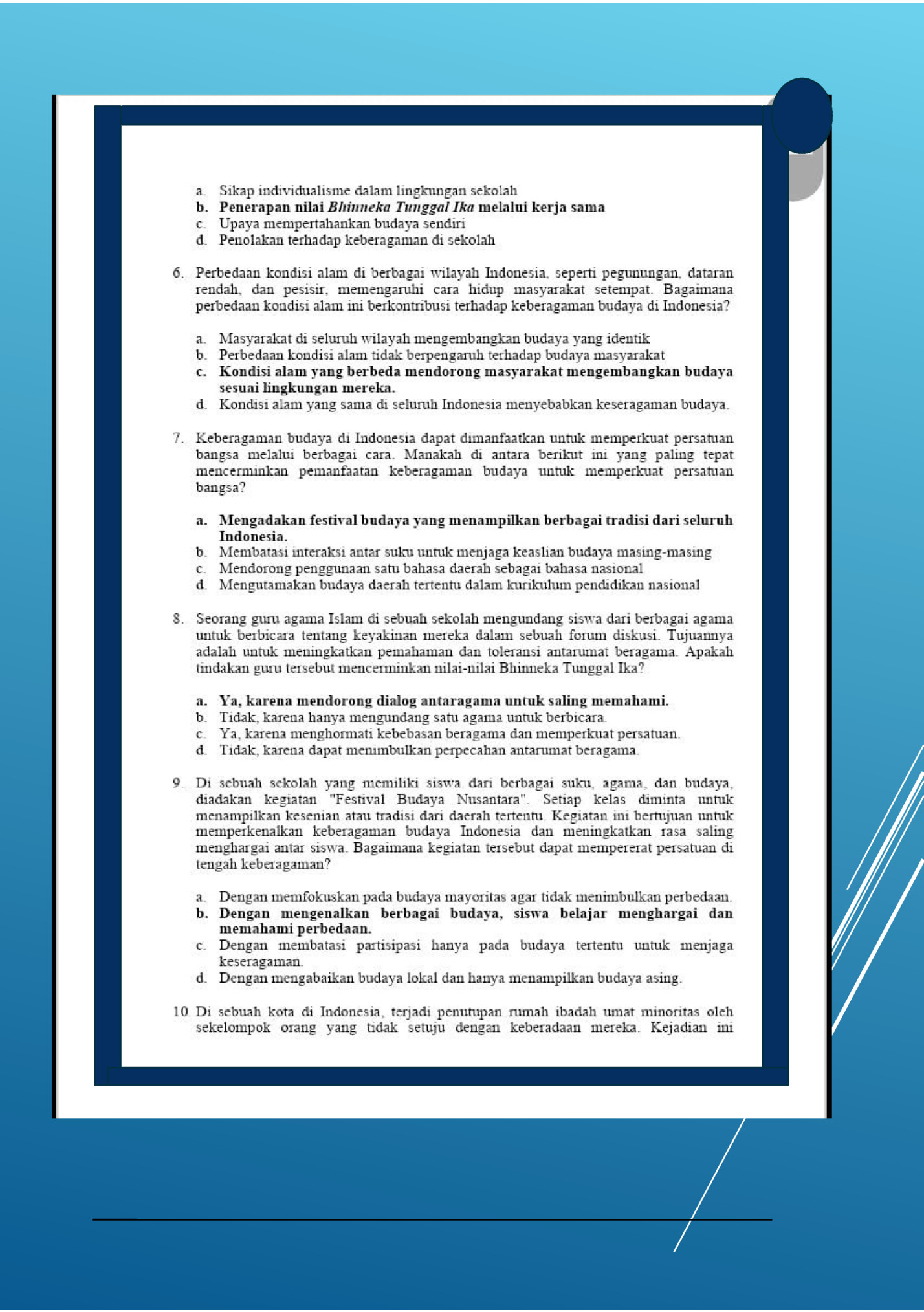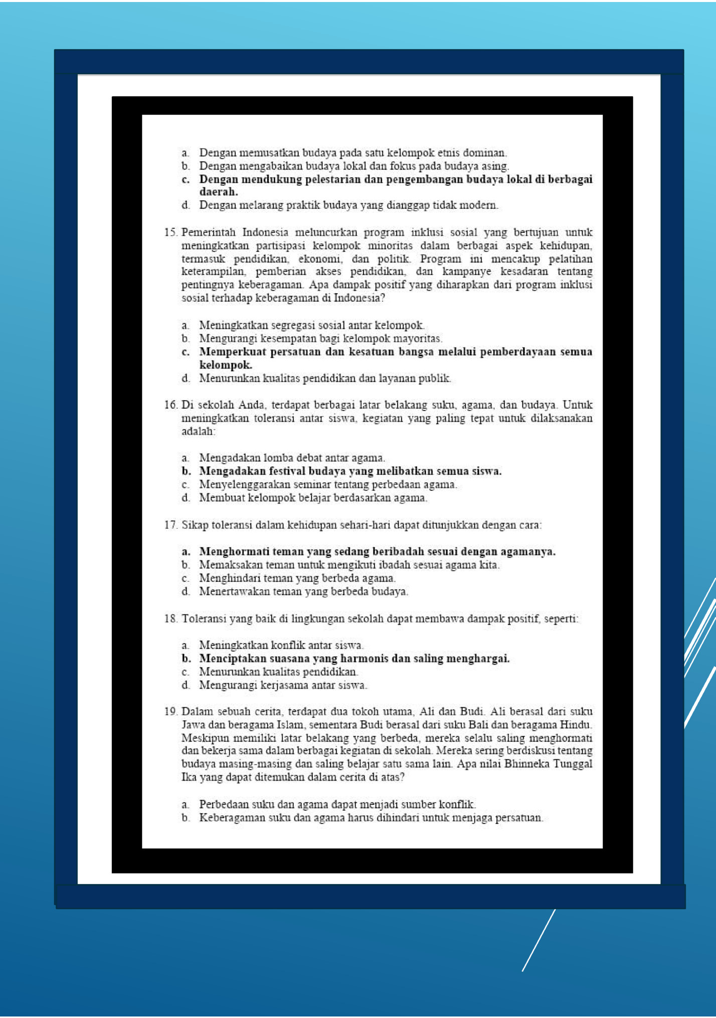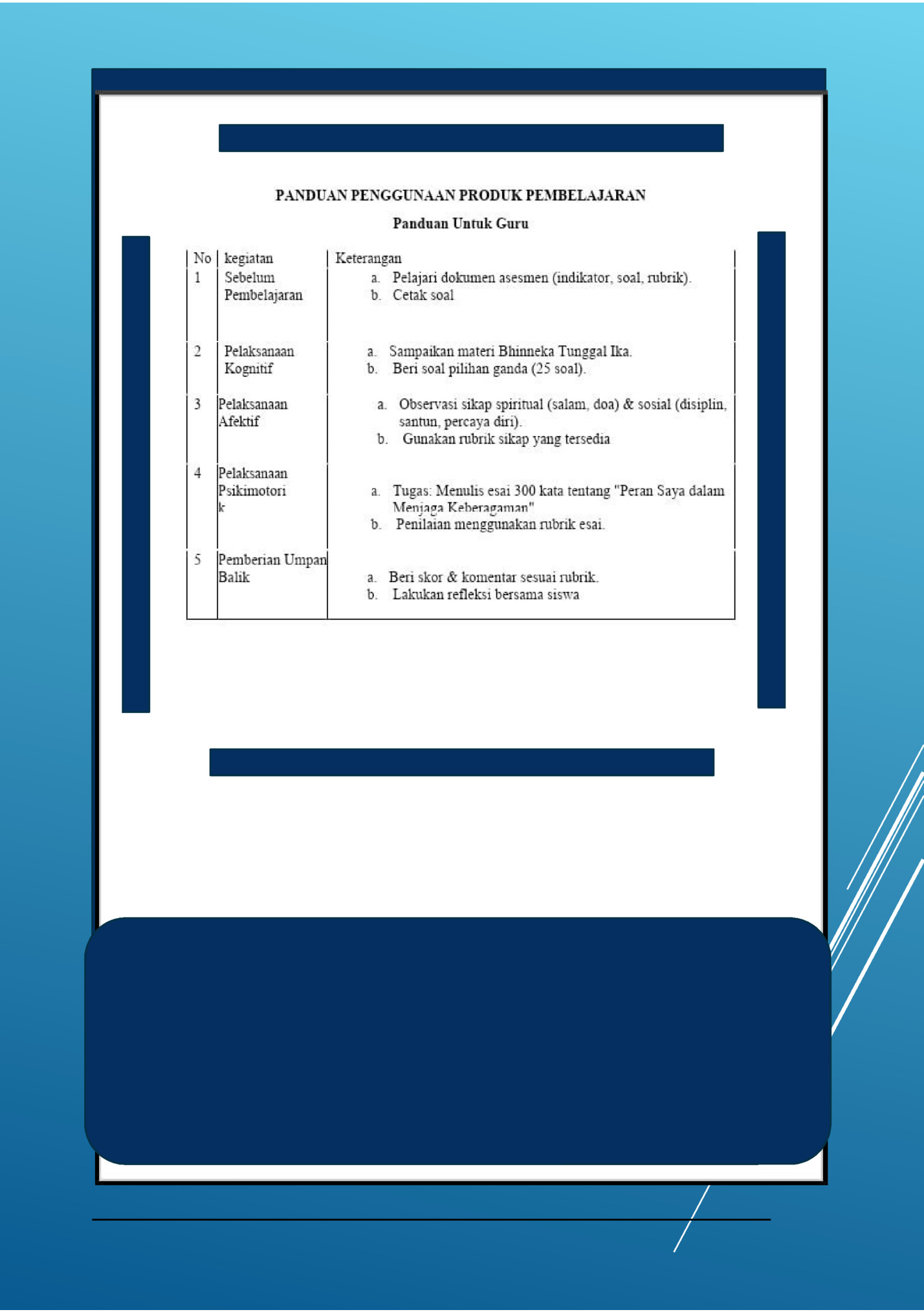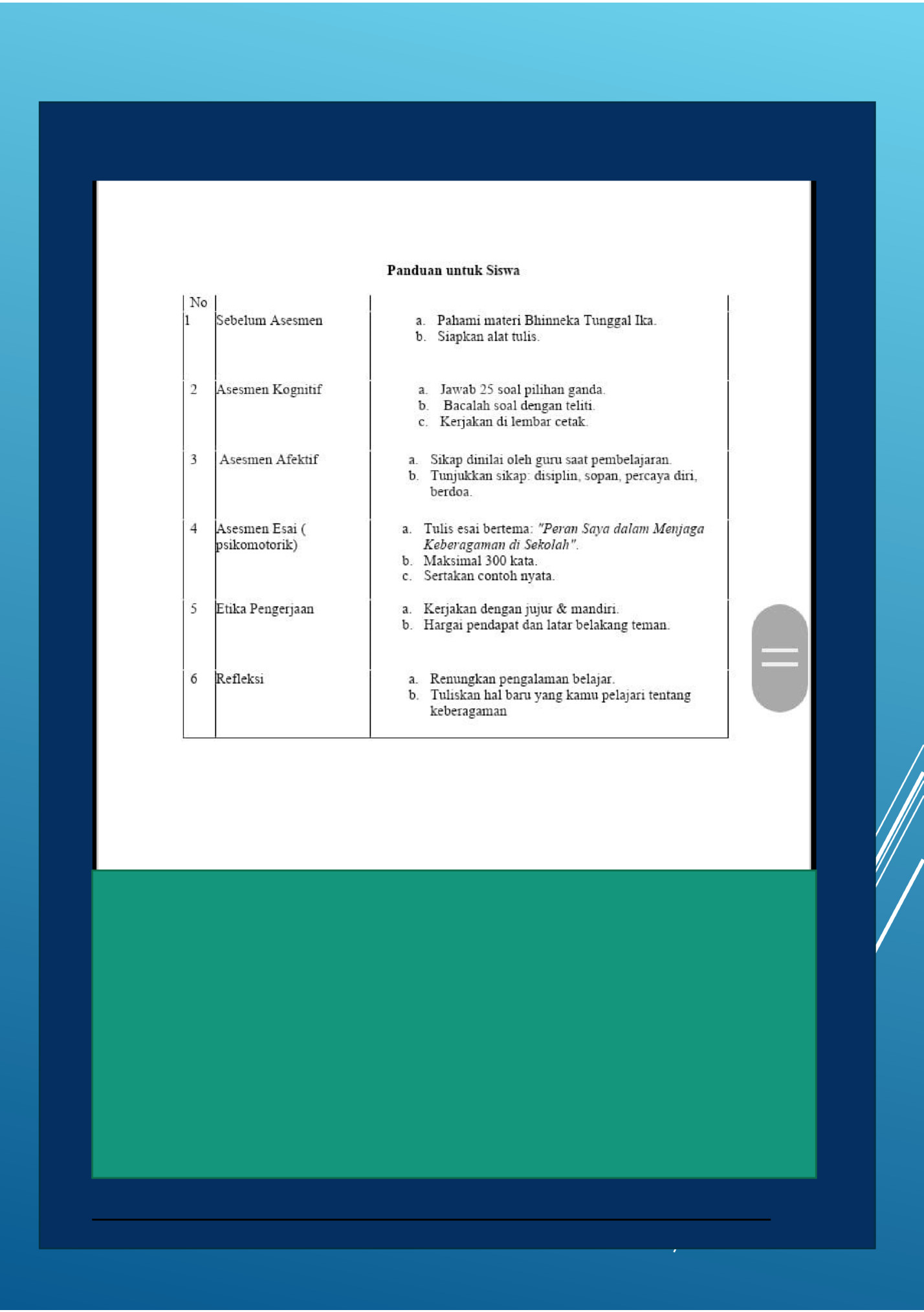 Penilaian  ini  disusun  untuk  mengukur  kemampuan  dan  pemahaman  siswa  dalam  mata  pelajaran  pendidikan  pancasila  kelas 7 tentang keberagaman dalam bhineka tunggal ika. Tujuan  dari  penilaian  ini  adalah  untuk  mengetahui  sejauh  mana  siswa  telah  mencapai  kompetensi  yang  diharapkan  dan  untuk  memberikan  umpan  balik  yang  konstruktif  bagi  siswa  dan  guru. Penilaian  ini  terdiri  dari tes  pilihan  ganda,  observasi dan  tes  esai  yang  dirancang  untuk  mengukur  kemampuan  siswa  dalam  aspek kognitif, afektif dan psikomotorik. kami berharap penilaian ini  dapat  membantu  meningkatkan  kualitas  pembelajaran  dan  memberikan informasi yang bermanfaat bagi siswa dan guru. Terima  kasih  atas  perhatian  dan  partisipasi  anda  dalam  penilaian  ini.