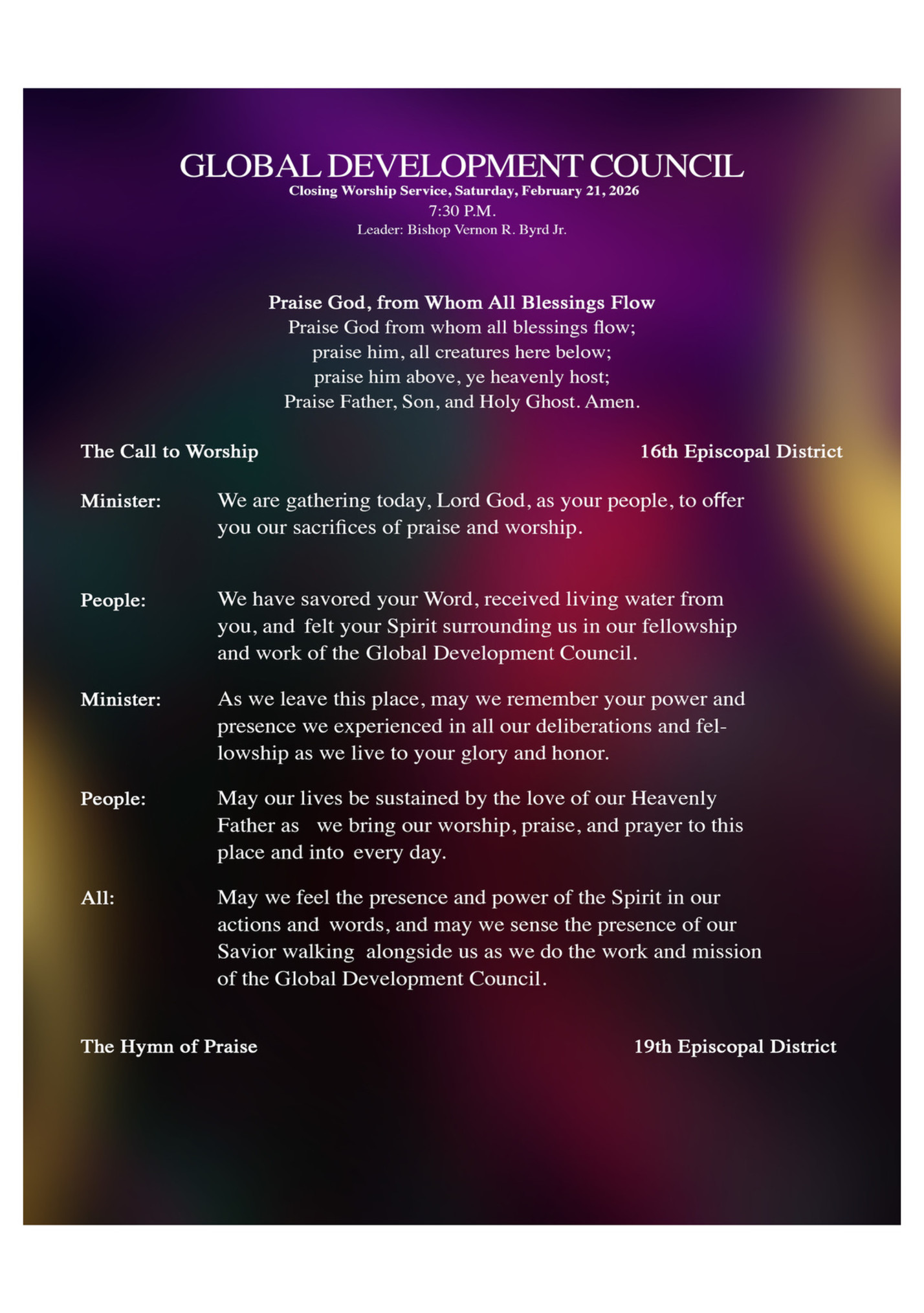 7:00 a.m. - 8:30 a.m. Breakfast (On your own) 8:30 a.m. - 9:00 a.m. Devotion 15th Episcopal District 9:00 a.m. - 10:30 a.m. Session IV Bishop Vernon R. Byrd Jr. Reading of the Minutes 10:30 a.m. - 12:30 p.m. Session V Bishop Henry Allen Belin III, Committee Breakout - Ms. Sharon Blaylock 12:30 p.m. - 2:00 p.m. Lunch 2:15 p.m. - 3:45 p.m. Session VI. Bishop Jeffery B. Cooper Sr., Committee Reports 3:45 p.m. - 4:15 p.m. Tea Break 4:30 p.m. - 6:00 p.m. Session VII Bishop Gregory V. Eason Dinner (On your own) Saturday, February 21, 2026 7:00 a.m. - 8:30 a.m. Breakfast (On Your Own) 8:00 a.m. - 8:30 p.m. Devotion 19th Episcopal District 8:30 a.m. - 11:00 Session VIII Bishop Paul J.M. Kawimbe