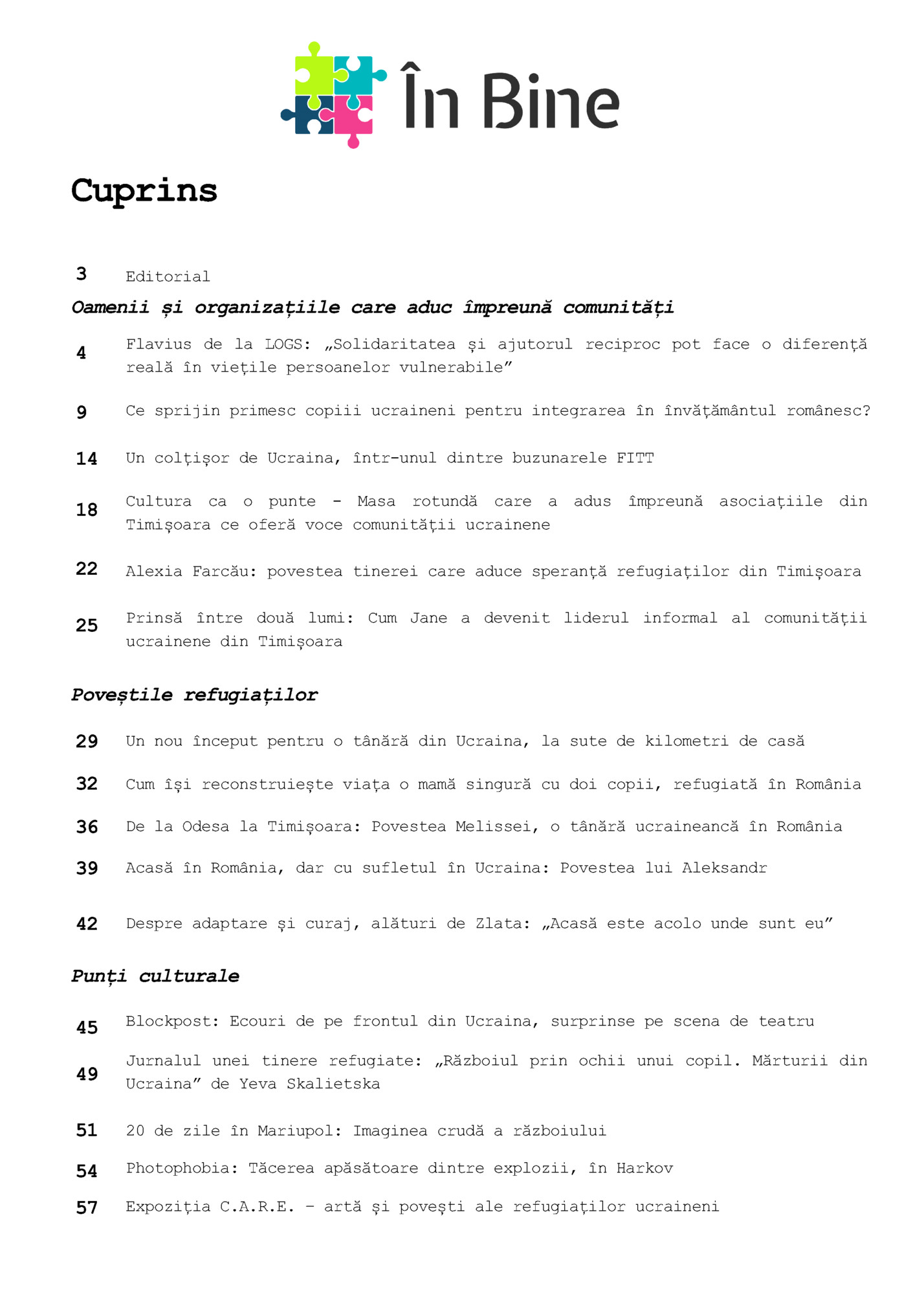 3 Editorial Oamenii și organizațiile care aduc împreună comunități 4 Flavius de la LOGS: „Solidaritatea și ajutorul reciproc pot face o diferență reală în viețile persoanelor vulnerabile” 9 Ce sprijin primesc copiii ucraineni pentru integrarea în învățământul românesc? 14 Un colțișor de Ucraina, într-unul dintre buzunarele FITT 18 Cultura ca o punte - Masa rotundă care a adus împreună asociațiile din Timișoara ce oferă voce comunității ucrainene 22 Alexia Farcău: povestea tinerei care aduce speranță refugiaților din Timișoara 25 Prinsă între două lumi: Cum Jane a devenit liderul informal al comunității ucrainene din Timișoara Poveștile refugiaților 29 Un nou început pentru o tânără din Ucraina, la sute de kilometri de casă 32 Cum își reconstruiește viața o mamă singură cu doi copii, refugiată în România 36 De la Odesa la Timișoara: Povestea Melissei, o tânără ucraineancă în România 39 Acasă în România, dar cu sufletul în Ucraina: Povestea lui Aleksandr 42 Despre adaptare și curaj, alături de Zlata: „Acasă este acolo unde sunt eu” Punți culturale 45 Blockpost: Ecouri de pe frontul din Ucraina, surprinse pe scena de teatru 49 Jurnalul unei tinere refugiate: „Războiul prin ochii unui copil. Mărturii din Ucraina” de Yeva Skalietska 51 20 de zile în Mariupol: Imaginea crudă a războiului 54 Photophobia: Tăcerea apăsătoare dintre explozii, în Harkov 57 Expoziția C.A.R.E. – artă și povești ale refugiaților ucraineni