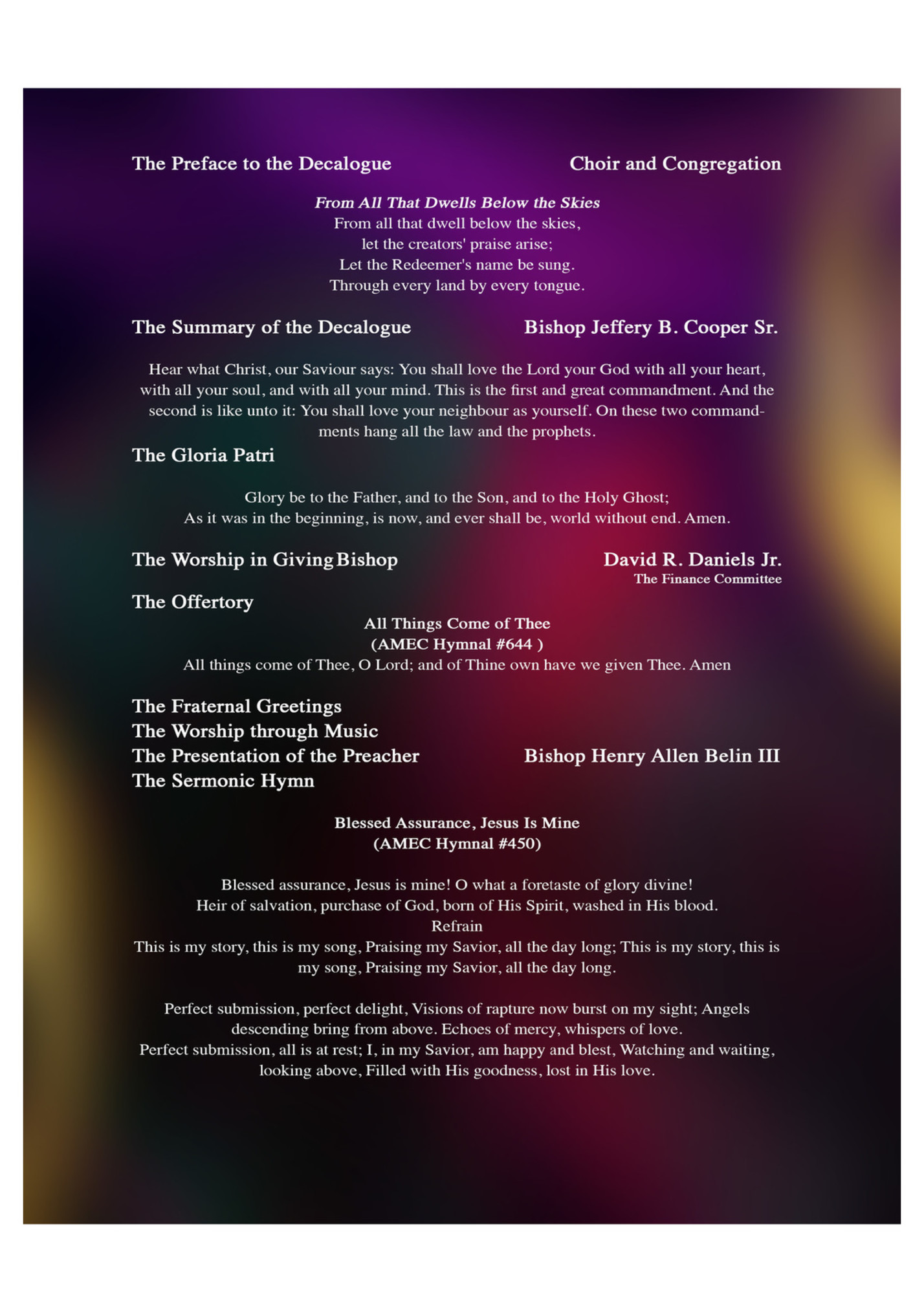 Invitation Bishop Gregory V. Eason You who do truly and earnestly repent of your sins, and are in love and charity with your neighbor, and intend to lead a new life, following the commandments of God, and are walking henceforth in His holy ways, draw near with faith and take this holy sacrament to your comfort; and make your humble confession to Almighty God, meekly kneeling. General Confession Bishop Jeffery B. Cooper Sr., Almighty God, Father of our Lord Jesus. Master of all things, Judge of all people, we acknowledge and bewail our manifold sins and wickedness, which we from time to time have most grievously committed by thought, word, and deed against Your Divine Majesty, provoking most justly Your wrath and indignation against us. We do earnestly repent and are heartily sorry for this our misdoings; the remembrance of them is grievous unto us. Have mercy upon us, have mercy upon us, most merciful Father, for Your Son our Lord Jesus Christ's sake; forgive us all that is past, and grant that we may ever hereafter serve and please you in newness of life, to the honor and glory of Your name, through Jesus Christ our Lord. Amen. Bishop Silvester S. Beaman First Collect Almighty God, our Heavenly Father, who of Your great mercy has promised forgiveness of sins to all those who with hearty repentance and true faith turn to you, have mercy upon us; pardon and deliver us from all our sins; confirm and strengthen us in all goodness; and bring us to everlasting life through Jesus Christ, our Lord. Amen. Second Collect Bishop David R. Daniels, Jr. Almighty God, to whom all hearts are open, all desires known, and from whom no secrets are hid, cleanse the thoughts of our hearts by the inspiration of Your Holy Spirit that we may perfectly love You and worthily magnify Your holy name through Jesus Christ, our Lord. Amen. Prayer of Adoration Bishop Jeffrey N. Leath It is very meet, right, and our bounden duty that we shall at all times, and in all places, give thanks to you, O Lord, Holy Father, Almighty, everlasting God. Therefore, with angels and archangels, and with all the company of heaven, we laud and magnify your Holy Name, evermore praising you and saying, "Holy, Holy, Holy, Lord God of hosts; heaven and earth are full of your glory." Glory be to you, O Lord, Most High. Amen.
