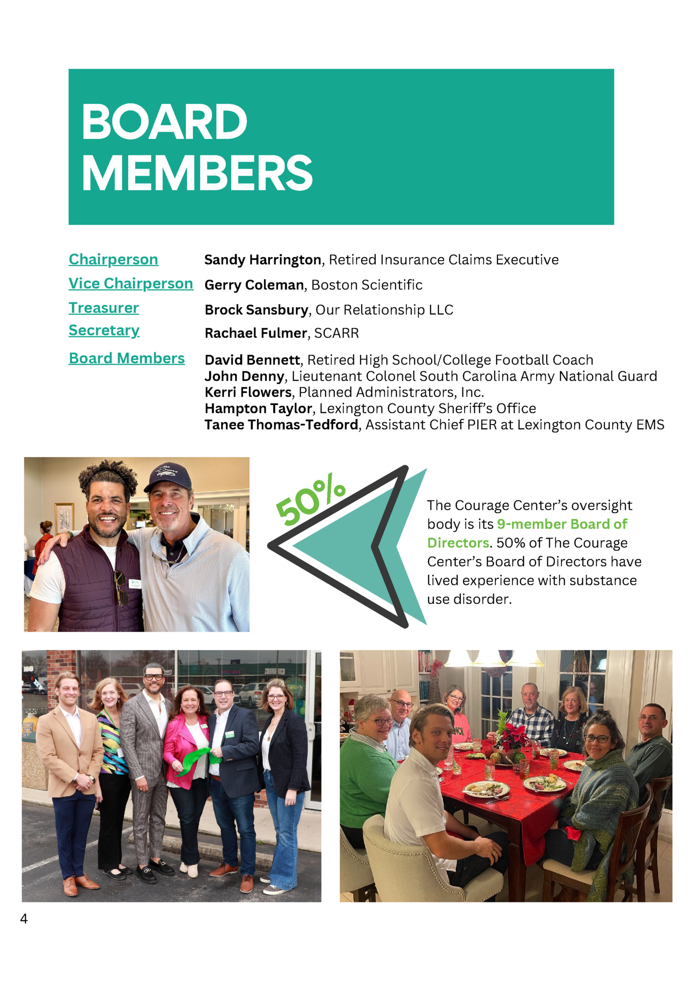 MEMBERS Chairperson Sandy Harrington, Retired Insurance Claims Executive Vice Chairperson Gerry Coleman, Boston Scientific Treasurer Brock Sansbury, Our Relationship LLC Secretary Rachael Fulmer, SCARR Board Members David Bennett, Retired High School/College Football Coach John Denny, Lieutenant Colonel South Carolina Army National Guard Kerri Flowers, Planned Administrators, Inc. Hampton Taylor, Lexington County Sheriff’s Office Tanee Thomas-Tedford, Assistant Chief PIER at Lexington County EMS 0% 5 4 The Courage Center’s oversight body is its 9-member Board of Directors. 50% of The Courage Center’s Board of Directors have lived experience with substance use disorder.