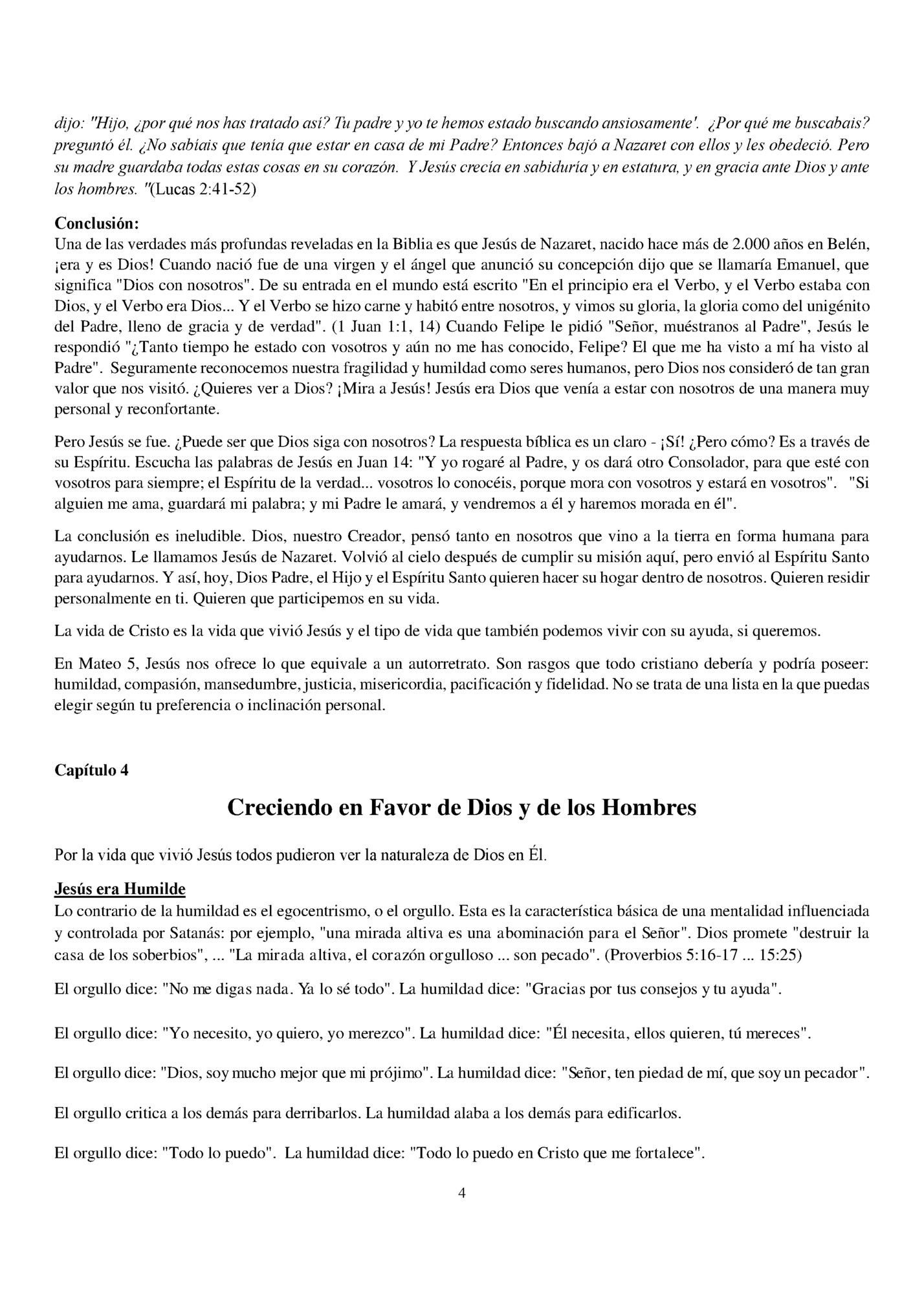 preguntó él. ¿No sabíais que tenía que estar en casa de mi Padre? Entonces bajó a Nazaret con ellos y les obedeció. Pero su madre guardaba todas estas cosas en su corazón. Y Jesús crecía en sabiduría y en estatura, y en gracia ante Dios y ante los hombres. "(Lucas 2:41-52) Conclusión: Una de las verdades más profundas reveladas en la Biblia es que Jesús de Nazaret, nacido hace más de 2.000 años en Belén, ¡era y es Dios! Cuando nació fue de una virgen y el ángel que anunció su concepción dijo que se llamaría Emanuel, que significa "Dios con nosotros". De su entrada en el mundo está escrito "En el principio era el Verbo, y el Verbo estaba con Dios, y el Verbo era Dios... Y el Verbo se hizo carne y habitó entre nosotros, y vimos su gloria, la gloria como del unigénito del Padre, lleno de gracia y de verdad". (1 Juan 1:1, 14) Cuando Felipe le pidió "Señor, muéstranos al Padre", Jesús le respondió "¿Tanto tiempo he estado con vosotros y aún no me has conocido, Felipe? El que me ha visto a mí ha visto al Padre". Seguramente reconocemos nuestra fragilidad y humildad como seres humanos, pero Dios nos consideró de tan gran valor que nos visitó. ¿Quieres ver a Dios? ¡Mira a Jesús! Jesús era Dios que venía a estar con nosotros de una manera muy personal y reconfortante. Pero Jesús se fue. ¿Puede ser que Dios siga con nosotros? La respuesta bíblica es un claro - ¡Sí! ¿Pero cómo? Es a través de su Espíritu. Escucha las palabras de Jesús en Juan 14: "Y yo rogaré al Padre, y os dará otro Consolador, para que esté con vosotros para siempre; el Espíritu de la verdad... vosotros lo conocéis, porque mora con vosotros y estará en vosotros". "Si alguien me ama, guardará mi palabra; y mi Padre le amará, y vendremos a él y haremos morada en él". La conclusión es ineludible. Dios, nuestro Creador, pensó tanto en nosotros que vino a la tierra en forma humana para ayudarnos. Le llamamos Jesús de Nazaret. Volvió al cielo después de cumplir su misión aquí, pero envió al Espíritu Santo para ayudarnos. Y así, hoy, Dios Padre, el Hijo y el Espíritu Santo quieren hacer su hogar dentro de nosotros. Quieren residir personalmente en ti. Quieren que participemos en su vida. La vida de Cristo es la vida que vivió Jesús y el tipo de vida que también podemos vivir con su ayuda, si queremos. En Mateo 5, Jesús nos ofrece lo que equivale a un autorretrato. Son rasgos que todo cristiano debería y podría poseer: humildad, compasión, mansedumbre, justicia, misericordia, pacificación y fidelidad. No se trata de una lista en la que puedas elegir según tu preferencia o inclinación personal. Capítulo 4 Creciendo en Favor de Dios y de los Hombres Por la vida que vivió Jesús todos pudieron ver la naturaleza de Dios en Él. Jesús era Humilde Lo contrario de la humildad es el egocentrismo, o el orgullo. Esta es la característica básica de una mentalidad influenciada y controlada por Satanás: por ejemplo, "una mirada altiva es una abominación para el Señor". Dios promete "destruir la casa de los soberbios", ... "La mirada altiva, el corazón orgulloso ... son pecado". (Proverbios 5:16-17 ... 15:25) El orgullo dice: "No me digas nada. Ya lo sé todo". La humildad dice: "Gracias por tus consejos y tu ayuda". El orgullo dice: "Yo necesito, yo quiero, yo merezco". La humildad dice: "Él necesita, ellos quieren, tú mereces". El orgullo dice: "Dios, soy mucho mejor que mi prójimo". La humildad dice: "Señor, ten piedad de mí, que soy un pecador". El orgullo critica a los demás para derribarlos. La humildad alaba a los demás para edificarlos. El orgullo dice: "Todo lo puedo". La humildad dice: "Todo lo puedo en Cristo que me fortalece". 4