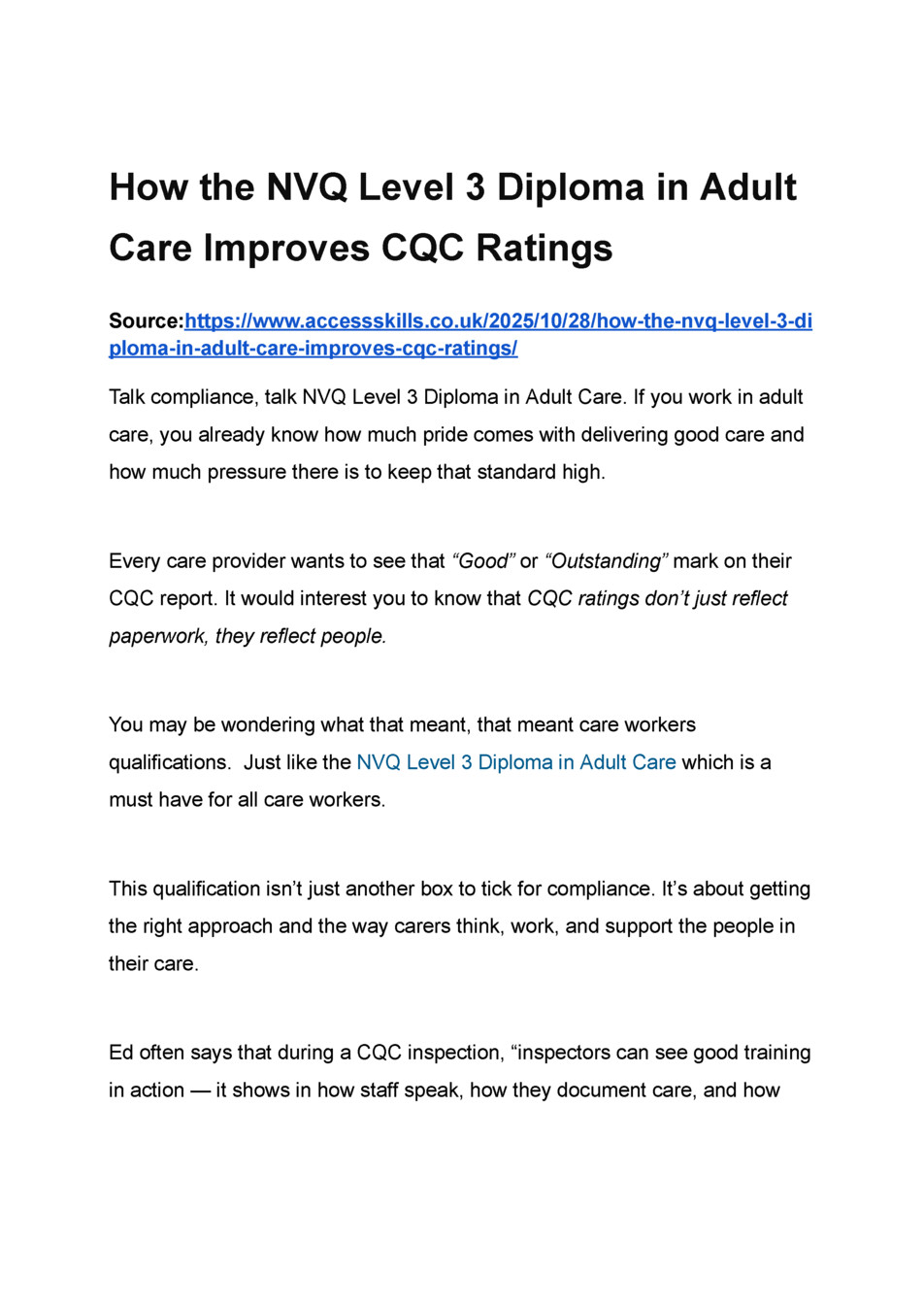 How NVQ Level 3 Diploma in Adult Care Boosts CQC Ratings