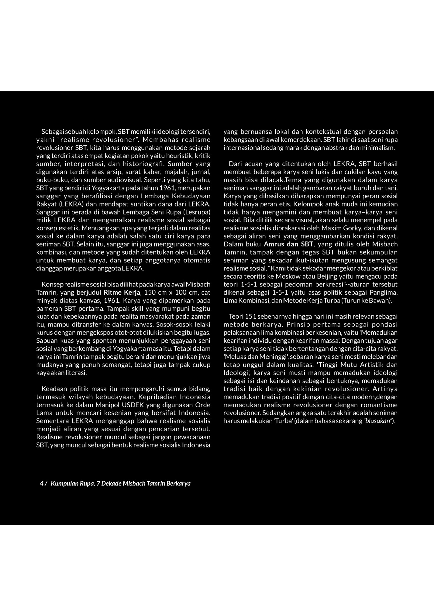 Katalog Besar yang menghimpun karya Misbach Tamrin ini merupakan perjalanan yang panjang tentang perjuangan dan memperjuangkan keyakinan yang dipilih seseorang memandang dunia dan kemanusiaan. Pemikiran dan keteguhan yang merobohkan semua tembok penghalang, dan penjara hanya mengurung para penjaganya. Dalam katalog besar Kumpulan Rupa, 7 Dekade Misbach Tamrin Berkarya (KR7DMTB) terbentang rupa yang berwarna, bagaimana ide/gagasan diwujudkan dengan idealisasi pemahaman beliau untuk kebangkitan Indonesia, bagaimana rupa alam, lingkungan, dan kebudayaan Kalimantan terinternalisasi kokoh dalam cara pandang beliau untuk mendorong kesadaran tentang kebebasan, keadilan, dan kemanusiaan harus diperjuangkan terus menerus, tiada perhentian untuk perlawanan pada ketidakadilan dan penistaan kemanusiaan. Akademi Bangku Panjang Mingguraya (ABPM) berupaya mengasuh terang dalam pemajuan kebudayaan. Upaya-upaya tersebut menjadi bagian dari penegasan gerak kebudayaan di Kalimantan Selatan, yang tentu saja tidak bisa dipisahkan dari sosok-sosok yang mewarnai pandangan hidup dan gagasan, kekaryaan, dan keteladanan. Pada kesempatan ini, sosok Misbach Tamrin menjadi penting di Indonesia, khususnya dalam bidang seni rupa, dengan keteguhan dan kebertahanan dalam berkarya dan mencintai bidang kekaryaan tersebut. Sosok Misbach Tamrin memberi warna dan pergumulan kebudayaan di Kalimantan Selatan dan Indonesia dengan ide/gagasan, seni lukis, seni patung, monumen, seni pahat, dan terlibat dalam perdebatan intelektual tentang pemajuan kebudayaan yang terhimpun dalam katalog besar ini, dan secara langsung dapat dilihat karyanya hingga kini berupa tugu, patung, monumen, dan seni pahat (relief) di beberapa kabupaten/kota di Kalimantan Selatan hingga Kalimantan Tengah. Kawasan Cahaya Bumi Selamat (CBS) di jantung kota Martapura, kabupaten Banjar merupakan saksi kekaryaan beliau yang bisa dilihat hingga sekarang. Melalui program Dana Indonesiana Kementrian Pendidikan, Kebudayaan, Riset dan Teknologi (Kemendikbudristek), bidang DKPM dari Museum dan Cagar Budaya, dan LPDP yang memampukan ABPM untuk mengasuh terang dalam mengupayakan katalog besar sosok Misbach Thamrin yang dilaksanakan dengan riset (Tim Riset) dan disusun oleh Yaksa Agus. Hal ini sebagai bentuk rasa hormat kepada beliau, dan ada keyakinan untuk menempatkan Misbach Thamrin sebagai maestro oleh pemerintah. IV / Kumpulan Rupa, 7 Dekade Misbach Tamrin Berkarya