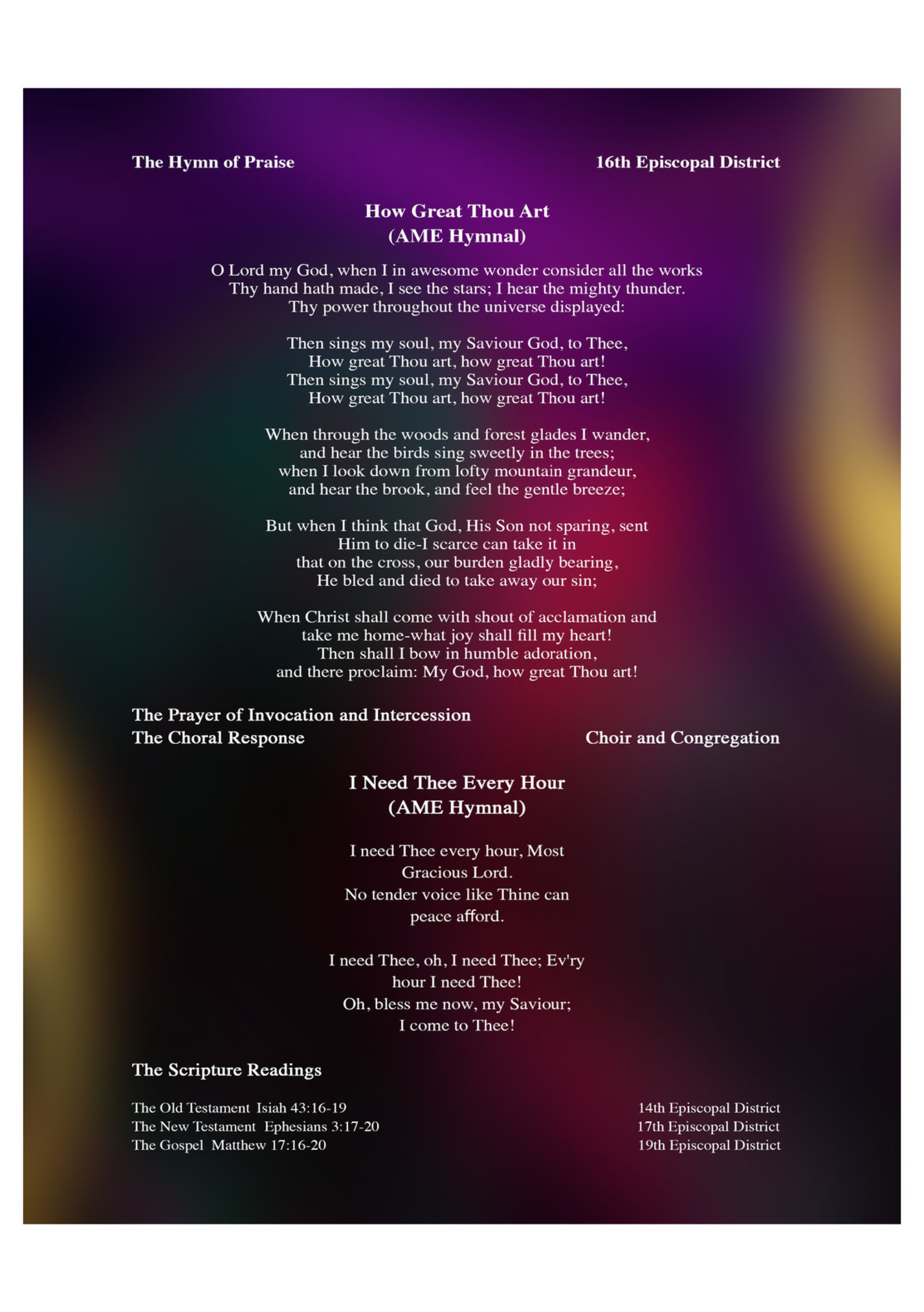 Invitation Bishop Gregory V. Eason You who do truly and earnestly repent of your sins, and are in love and charity with your neighbor, and intend to lead a new life, following the commandments of God, and are walking henceforth in His holy ways, draw near with faith and take this holy sacrament to your comfort; and make your humble confession to Almighty God, meekly kneeling. General Confession Bishop Jeffery B. Cooper Sr., Almighty God, Father of our Lord Jesus. Master of all things, Judge of all people, we acknowledge and bewail our manifold sins and wickedness, which we from time to time have most grievously committed by thought, word, and deed against Your Divine Majesty, provoking most justly Your wrath and indignation against us. We do earnestly repent and are heartily sorry for this our misdoings; the remembrance of them is grievous unto us. Have mercy upon us, have mercy upon us, most merciful Father, for Your Son our Lord Jesus Christ's sake; forgive us all that is past, and grant that we may ever hereafter serve and please you in newness of life, to the honor and glory of Your name, through Jesus Christ our Lord. Amen. Bishop Silvester S. Beaman First Collect Almighty God, our Heavenly Father, who of Your great mercy has promised forgiveness of sins to all those who with hearty repentance and true faith turn to you, have mercy upon us; pardon and deliver us from all our sins; confirm and strengthen us in all goodness; and bring us to everlasting life through Jesus Christ, our Lord. Amen. Second Collect Bishop David R. Daniels, Jr. Almighty God, to whom all hearts are open, all desires known, and from whom no secrets are hid, cleanse the thoughts of our hearts by the inspiration of Your Holy Spirit that we may perfectly love You and worthily magnify Your holy name through Jesus Christ, our Lord. Amen. Prayer of Adoration Bishop Jeffrey N. Leath It is very meet, right, and our bounden duty that we shall at all times, and in all places, give thanks to you, O Lord, Holy Father, Almighty, everlasting God. Therefore, with angels and archangels, and with all the company of heaven, we laud and magnify your Holy Name, evermore praising you and saying, "Holy, Holy, Holy, Lord God of hosts; heaven and earth are full of your glory." Glory be to you, O Lord, Most High. Amen.
