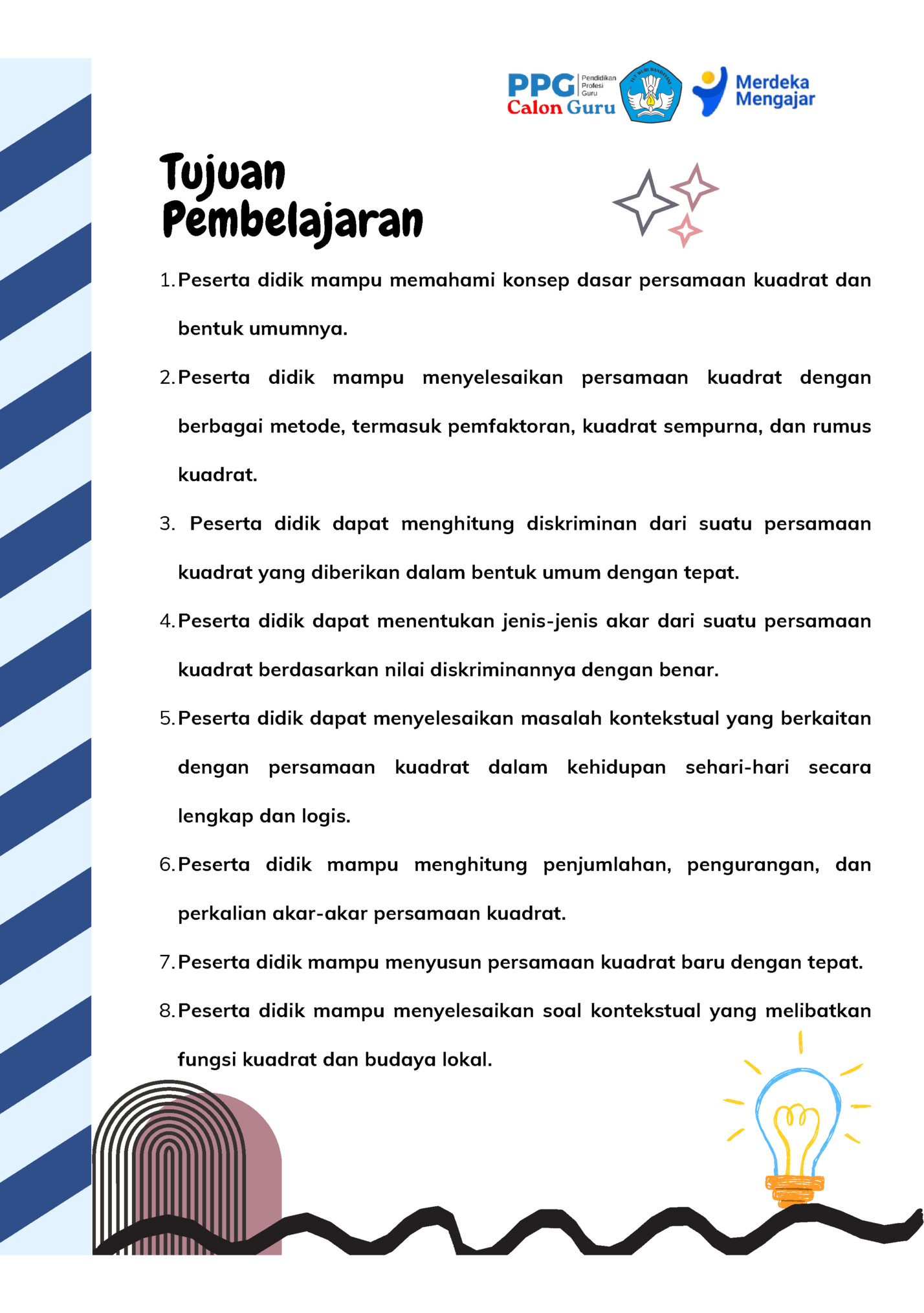 Pembelajaran 1. Peserta didik mampu memahami konsep dasar persamaan kuadrat dan bentuk umumnya. 2. Peserta didik mampu menyelesaikan persamaan kuadrat dengan berbagai metode, termasuk pemfaktoran, kuadrat sempurna, dan rumus kuadrat. 3. Peserta didik dapat menghitung diskriminan dari suatu persamaan kuadrat yang diberikan dalam bentuk umum dengan tepat. 4. Peserta didik dapat menentukan jenis-jenis akar dari suatu persamaan kuadrat berdasarkan nilai diskriminannya dengan benar. 5. Peserta didik dapat menyelesaikan masalah kontekstual yang berkaitan dengan persamaan kuadrat dalam kehidupan sehari-hari secara lengkap dan logis. 6. Peserta didik mampu menghitung penjumlahan, pengurangan, dan perkalian akar-akar persamaan kuadrat. 7. Peserta didik mampu menyusun persamaan kuadrat baru dengan tepat. 8. Peserta didik mampu menyelesaikan soal kontekstual yang melibatkan fungsi kuadrat dan budaya lokal.