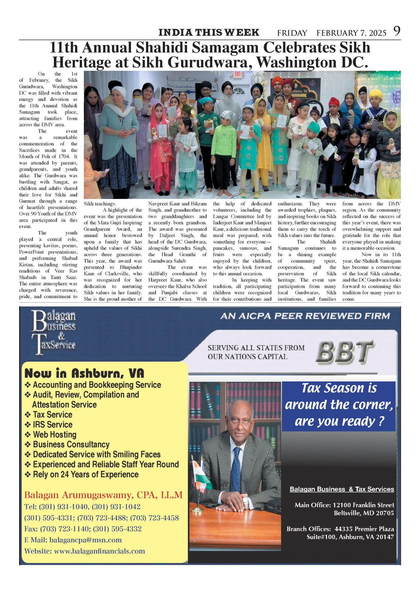 FRIDAY FEBRUARY 7, 2025 11th Annual Shahidi Samagam Celebrates Sikh Heritage at Sikh Gurudwara, Washington DC. On the 1st of February, the Sikh Gurudwara, Washington DC was filled with vibrant energy and devotion as the 11th Annual Shahidi Samagam took place, attracting families from across the DMV area. The event was a remarkable commemoration of the Sacrifices made in the Month of Poh of 1704. It was attended by parents, grandparents, and youth alike. The Gurdwara was bustling with Sangat, as children and adults shared their love for Sikhi and Gurmat through a range of heartfelt presentations. Over 90 Youth of the DMV area participated in this event. The youth played a central role, presenting kavitas, poems, PowerPoint presentations, and performing Shabad Kirtan, including stirring renditions of Veer Ras Shabads in Tanti Saaz. The entire atmosphere was charged with reverence, pride, and commitment to Sikh teachings. A highlight of the event was the presentation of the Mata Gujri Inspiring Grandparent Award, an annual honor bestowed upon a family that has upheld the values of Sikhi across three generations. This year, the award was presented to Bhupinder Kaur of Clarksville, who was recognized for her dedication to nurturing Sikh values in her family. She is the proud mother of Navpreet Kaur and Bikram Singh, and grandmother to two granddaughters and a recently born grandson. The award was presented by Daljeet Singh, the head of the DC Gurdwara, alongside Surendra Singh, the Head Granthi of Gurudwara Sahib The event was skillfully coordinated by Harpreet Kaur, who also oversees the Khalsa School and Punjabi classes at the DC Gurdwara. With Now in Ashburn, VA ❖ Accounting and Bookkeeping Service ❖ Audit, Review, Compilation and Attestation Service ❖ Tax Service ❖ IRS Service ❖ Web Hosting ❖ Business Consultancy ❖ Dedicated Service with Smiling Faces ❖ Experienced and Reliable Staff Year Round ❖ Rely on 24 Years of Experience Balagan Arumugaswamy, CPA, LL.M Tel: (301) 931-1040, (301) 931-1042 (301) 595-4331; (703) 723-4488; (703) 723-4458 Fax: (703) 723-1140; (301) 595-4332 E Mail: balagancpa@msn.com Website: www.balaganfinancials.com the help of dedicated volunteers, including the Langar Committee led by Inderjeet Kaur and Manjeet Kaur, a delicious traditional meal was prepared, with something for everyone— pancakes, samosas, and fruits were especially enjoyed by the children, who always look forward to this annual occasion. In keeping with tradition, all participating children were recognized for their contributions and enthusiasm. They were awarded trophies, plaques, and inspiring books on Sikh history, further encouraging them to carry the torch of Sikh values into the future. The Shahidi Samagam continues to be a shining example of community spirit, cooperation, and the preservation of Sikh heritage. The event saw participation from many local Gurdwaras, Sikh institutions, and families 9 from across the DMV region. As the community reflected on the success of this year’s event, there was overwhelming support and gratitude for the role that everyone played in making it a memorable occasion. Now in its 11th year, the Shahidi Samagam has become a cornerstone of the local Sikh calendar, and the DC Gurdwara looks forward to continuing this tradition for many years to come. Tax Season is around the corner, are you ready ? Balagan Business & Tax Services Main Office: 12100 Franklin Street Beltsville, MD 20705 Branch Offices: 44335 Premier Plaza Suite#100, Ashburn, VA 20147