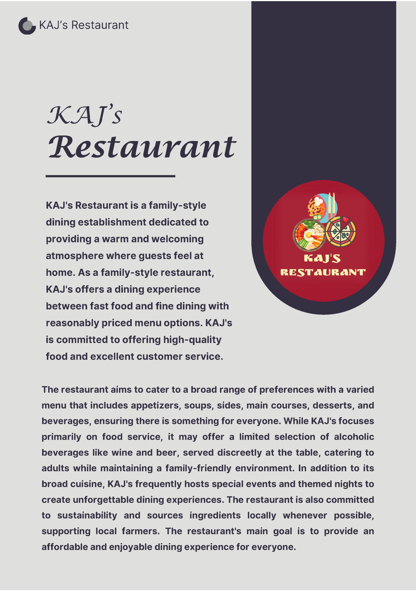 KAJ’s Restaurant KAJ's Restaurant is a family-style dining establishment dedicated to providing a warm and welcoming atmosphere where guests feel at home. As a family-style restaurant, KAJ's offers a dining experience between fast food and fine dining with reasonably priced menu options. KAJ's is committed to offering high-quality food and excellent customer service. The restaurant aims to cater to a broad range of preferences with a varied menu that includes appetizers, soups, sides, main courses, desserts, and beverages, ensuring there is something for everyone. While KAJ's focuses primarily on food service, it may offer a limited selection of alcoholic beverages like wine and beer, served discreetly at the table, catering to adults while maintaining a family-friendly environment. In addition to its broad cuisine, KAJ's frequently hosts special events and themed nights to create unforgettable dining experiences. The restaurant is also committed to sustainability and sources ingredients locally whenever possible, supporting local farmers. The restaurant's main goal is to provide an affordable and enjoyable dining experience for everyone.