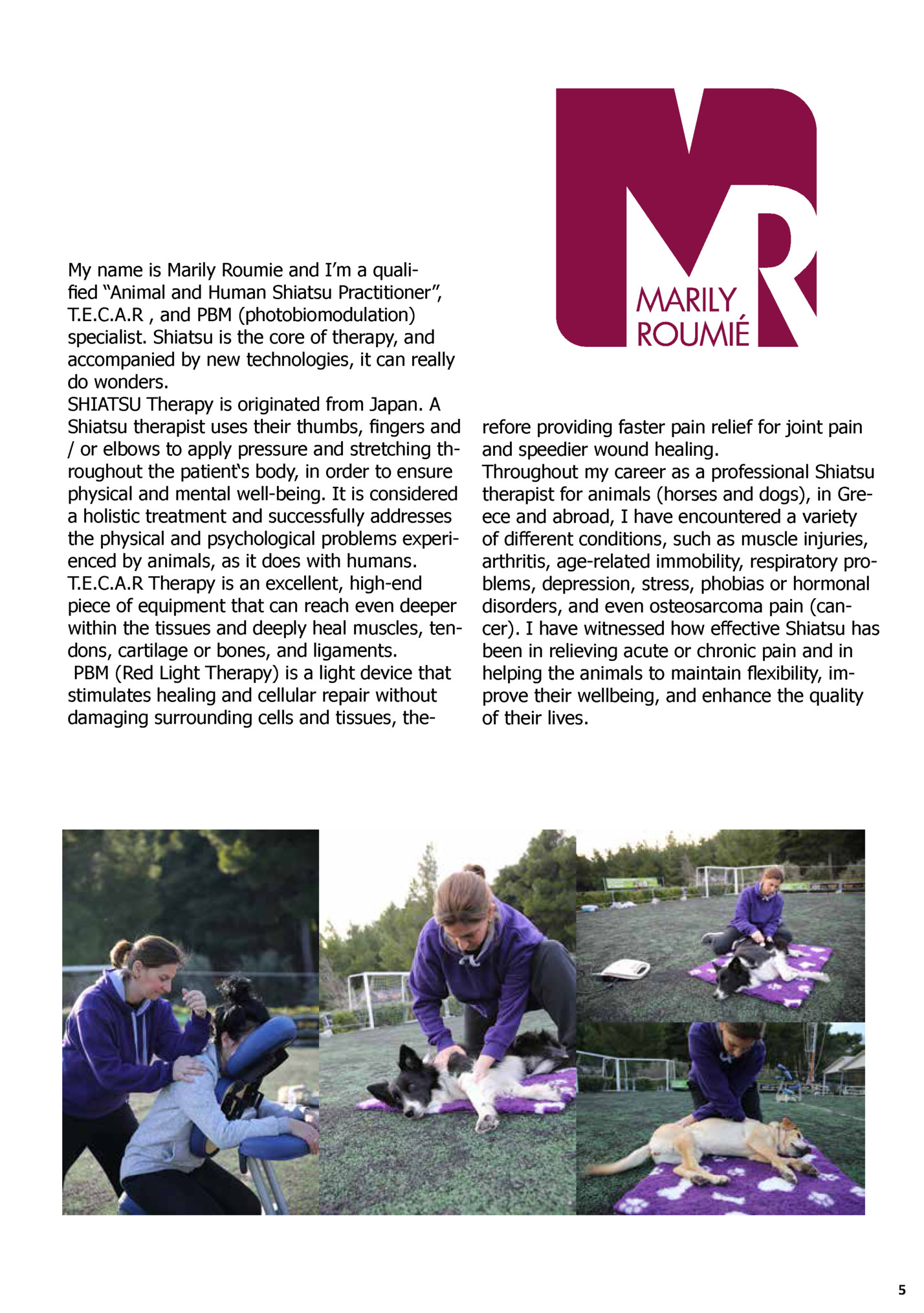 T.E.C.A.R , and PBM (photobiomodulation) specialist. Shiatsu is the core of therapy, and accompanied by new technologies, it can really do wonders. SHIATSU Therapy is originated from Japan. A Shiatsu therapist uses their thumbs, fingers and / or elbows to apply pressure and stretching throughout the patient‘s body, in order to ensure physical and mental well-being. It is considered a holistic treatment and successfully addresses the physical and psychological problems experienced by animals, as it does with humans. T.E.C.A.R Therapy is an excellent, high-end piece of equipment that can reach even deeper within the tissues and deeply heal muscles, tendons, cartilage or bones, and ligaments. PBM (Red Light Therapy) is a light device that stimulates healing and cellular repair without damaging surrounding cells and tissues, the- refore providing faster pain relief for joint pain and speedier wound healing. Throughout my career as a professional Shiatsu therapist for animals (horses and dogs), in Greece and abroad, I have encountered a variety of different conditions, such as muscle injuries, arthritis, age-related immobility, respiratory problems, depression, stress, phobias or hormonal disorders, and even osteosarcoma pain (cancer). I have witnessed how effective Shiatsu has been in relieving acute or chronic pain and in helping the animals to maintain flexibility, improve their wellbeing, and enhance the quality of their lives. 5