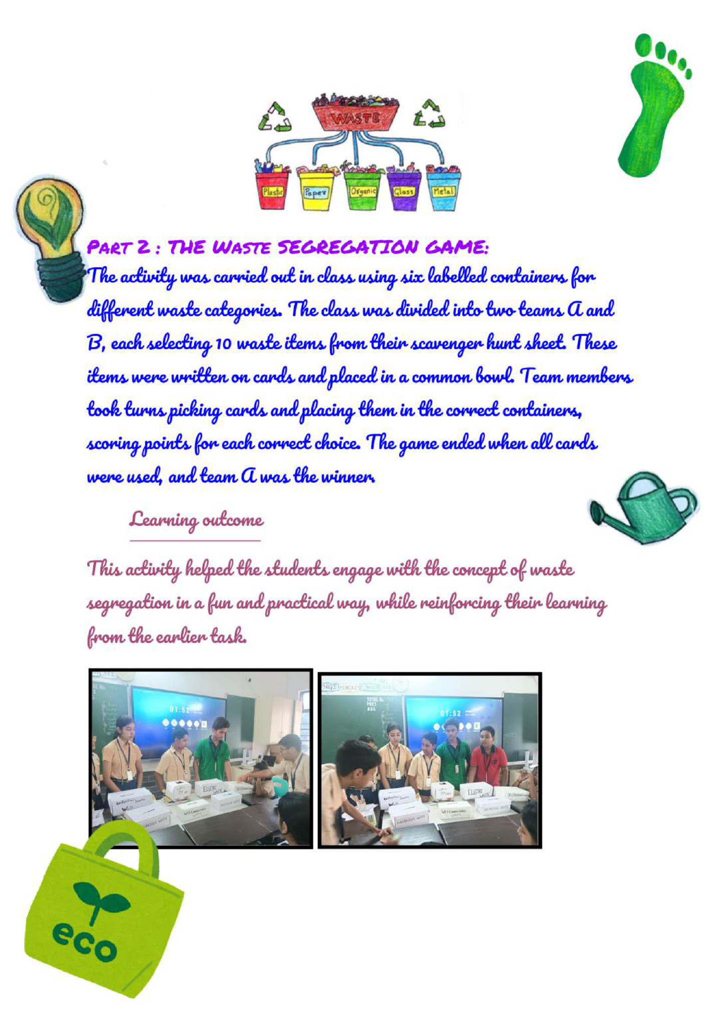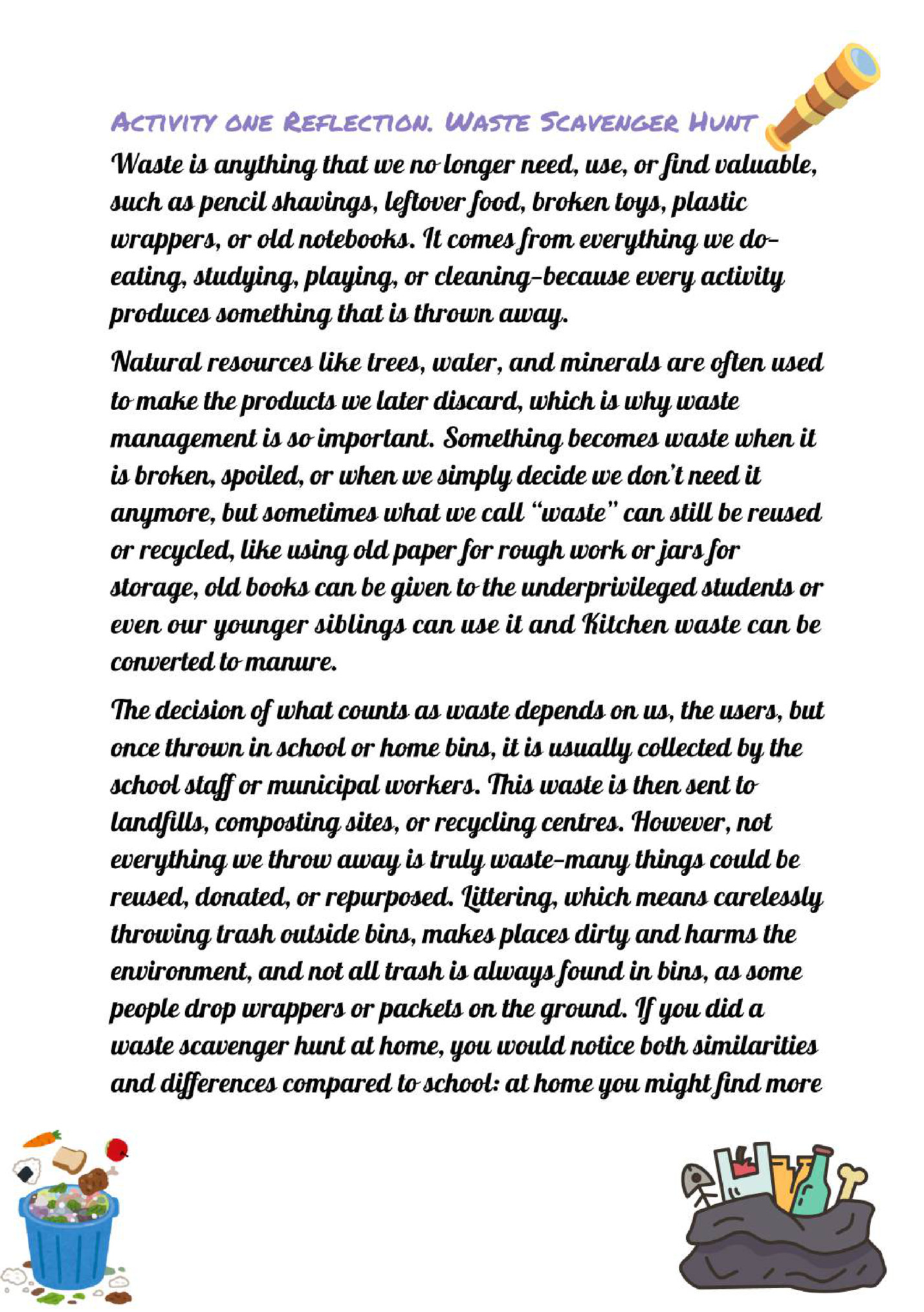 Part A: Understanding Our Relationship with Waste Compulsory Activity 1. Waste Scavenger Hunt 2. Categorizing waste-Is it all the same? 3. Where does waste go and why is it a problem 4. Segregating waste and composting 5. The ‘R’s of waste for a Zero waste school Part A Elective Activities. 1. Then and now 2. Agriculture and waste Reflection of interview Agricultural waste put to use in modern times -QUDRAT Part B compulsory activity – essay Moving communities towards Sustainable Waste Management-- A road map to change