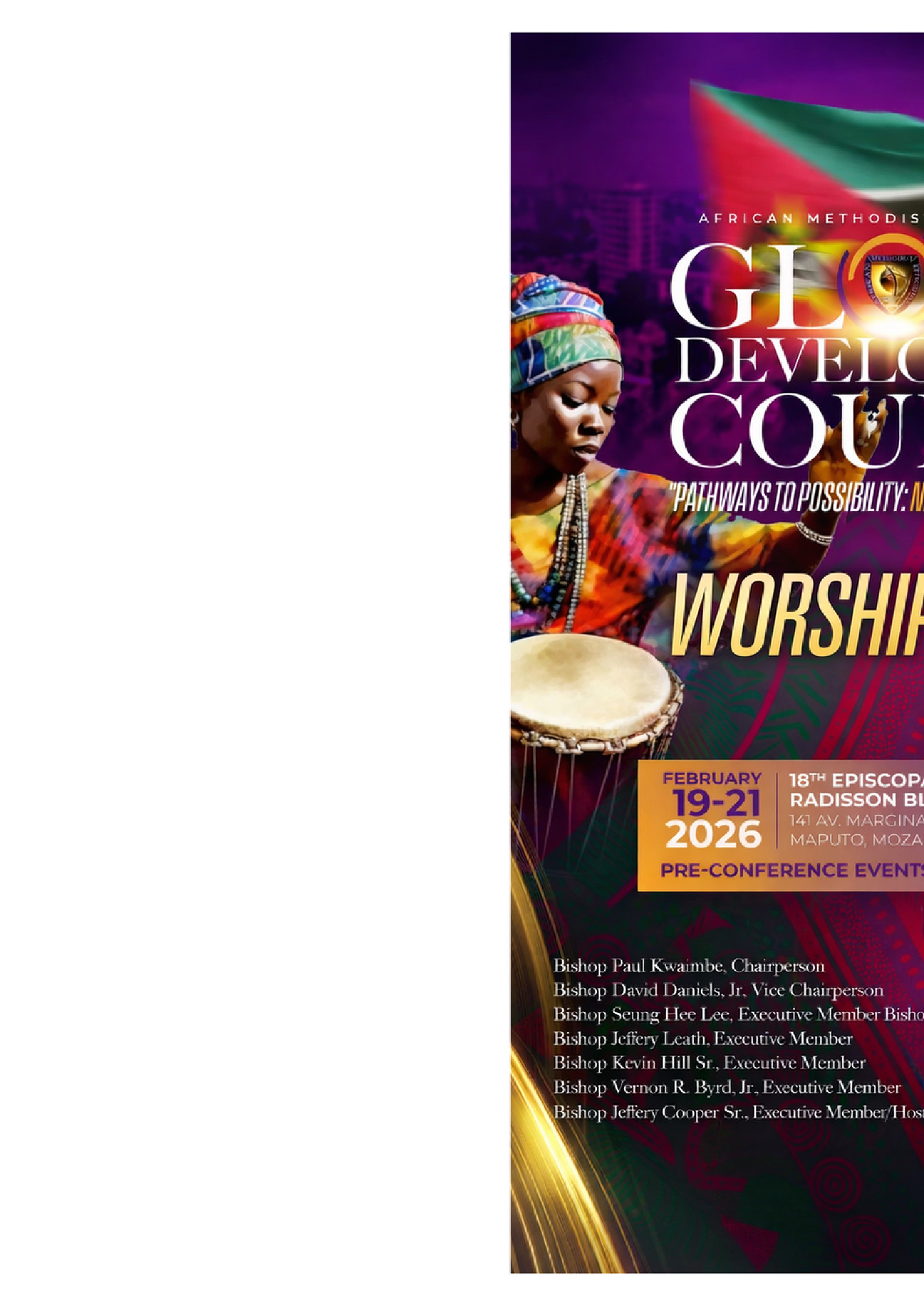 13th General Assembly Program Theme: Pathways to Possibility: Navigating Growth in Faith Tuesday, Feb 17, 2026 - Saturday, Feb 21, 2026 Radisson Blu Hotel & Residence Maputo, Mozambique Hosted by 18th Episcopal District Agenda Tuesday, February 17, 2026 9:00am - 1:00pm RAYAC Convergence 10:00 a.m. - 6:00 pm GDC Registration 2:00 p.m. 3:30 pm WMS Meeting 8:00 a.m. 4:30 pm WIM Meeting 4:00 pm - 6:00 p.m. LOADI Executive Board Meeting Wednesday, February 18, 2026 8:00 am - 5:00 p.m. GDC Registration 8:00 am - 12:30 p.m. LOADI Business Session 1 10:00 am Tea Break 12:30 pm - 1:45 p.m. Lunch 2:00 pm - 5:00 p.m. LOADI Business Session 2 5:00 pm Tea Break 5:30 pm - 7:15 p.m. Dinner on your own 7:30 p.m. Opening Worship Service Thursday, February 19, 2026 7:00 a.m. - 8:30 a.m. Breakfast on your own 9:00 a.m. - 10:00 a.m. Session I. Bishop Paul J.M. Kawimbe 10:00 a.m. - 10:30 a.m. Tea Break 10:30 a.m. -12:30 p.m. Session II. Bishop Wilfred J. Messiah 12: 30 p.m. - 2:00 p.m. Lunch 2: 00 p.m. - 3:45 p.m. Session III Bishop David R. Daniels, Jr. 3:50 p.m. - 5:50 p.m. Session IV Bishop Jeffrey N. Leath Dinner (On your own) 7:00 p.m. 18th Episcopal District Choral Music