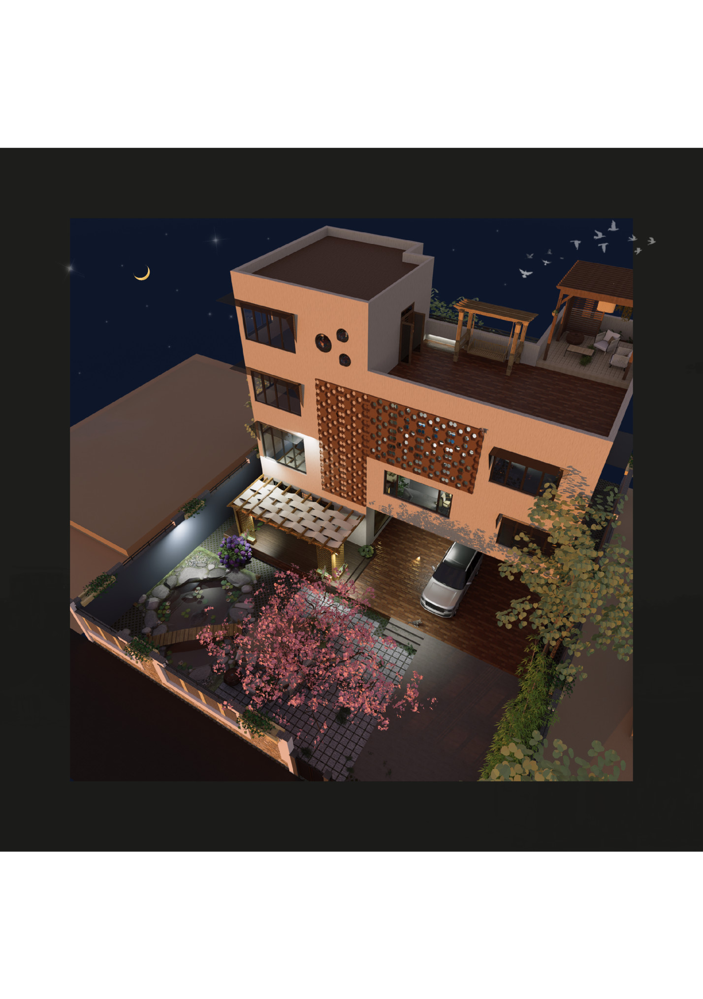 DESIGN La Vue Belle means “Beautiful View”. 01 The design revolved around a family of 5 - A couple, a pair of siblings . . . a brother and sister with their grandma as a uniting soul. Their work professions being too different, hardly they had time to sit together hence the design attempted to create a visual relationship between them along with catering to their personal space requiremnts. From each floor you can see what’s happening on the other floor. Moreover taking environmental conditions in consideration and a modular approach to the high end life style of clients, I made sure to promote natural ventilation through attempts like integration of jali walls — a maximum use of existing site vegetation.